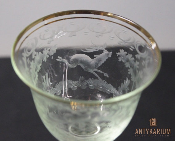 Stary kryształowy kielich ręcznie szlifowany z poświatą zieleni , scena z polowania daniel w skoku w lesie , obrzeża czaszy kielicha zdobione złotem, podstawa kielicha zdobiona złotem. Kielich w bardzo dobrym stanie , wysokośc 20,5cm , średnica czaszy 8,5 cm , średnica podstawy 7 cm.Antykarium.pl