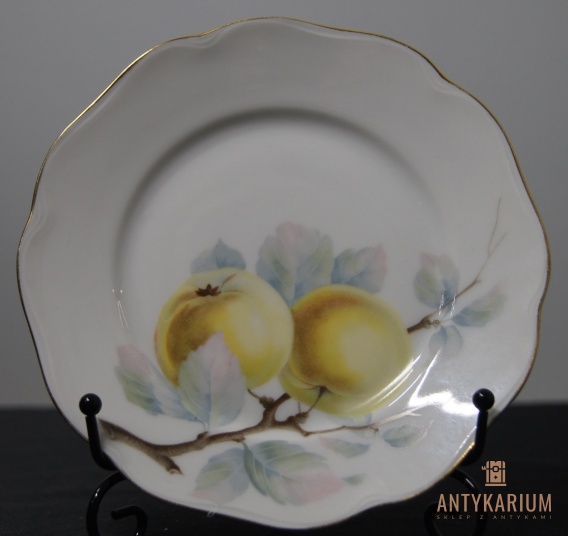 Patera talerz porcelana Rosenthal Kronach-Bawaria dekoracje Auguste Viktoria Przepięknie zdobiona motywem owoców brzegi naczynia są faliste i wykończone złotym paskiem średnica  17cm wysokość 2cm.